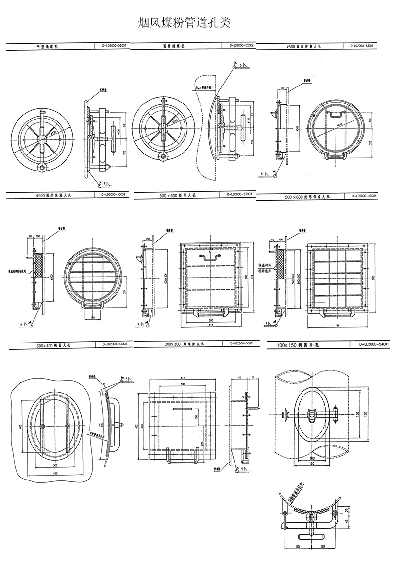 煙風煤粉管道孔類:                                            平壁捅煤孔、圓壁捅煤孔、500圓形焊制人孔、500圓形保溫人孔、500*600矩形人孔、500*600矩形保溫人孔、300*400橢圓形人孔、100*150橢圓形手孔、300*300煙道除灰孔
