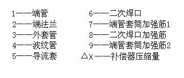 一次性補償器的結(jié)構(gòu)如圖所示,其伸縮元件因只使用一次,且預(yù)熱時介質(zhì)壓力較低,所以波紋管可以有很大的壓縮量,這使得它同普通補償器相比可大大降低造價。一次性補償器外套管在管道運行中將會承受介質(zhì)壓力,因此其壁厚不應(yīng)小于同等直徑標準管道壁厚。因整個補償器外殼所承受的應(yīng)力較大,所以加強筋較多。在一次性補償器吸收管道伸長量后將二次焊口密封焊接牢固,由于二次焊口受剪切應(yīng)力,推薦采用兩層三遍焊接,如圖所示。