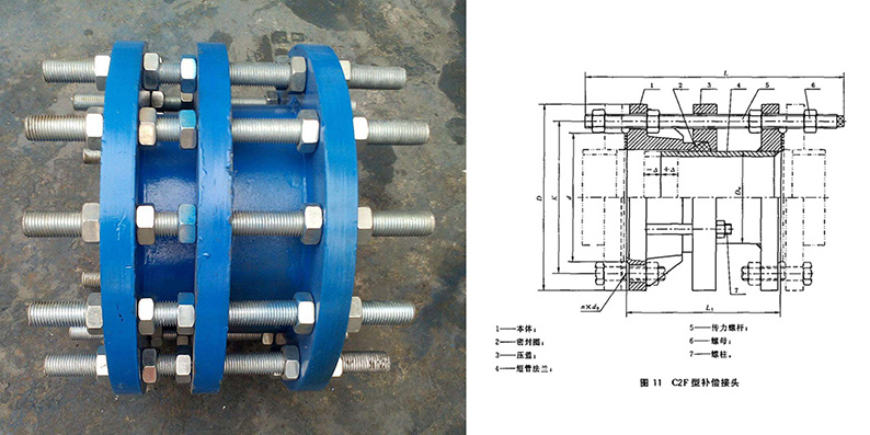 VSSJAF/C2F雙法蘭傳力接頭由法蘭式松套伸縮 接頭和短管法蘭、傳力螺桿、等構(gòu)件組成。它能傳遞被連接件的壓力推力(盲板力)和補(bǔ)償管路安裝誤差,不能吸收軸向位移,主要用于與泵、閥門等附件的松套連接。優(yōu)點(diǎn):安裝簡(jiǎn)單方便,方便閥門安裝;特點(diǎn):雙法蘭連接方式。