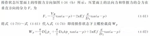 為達到初始預緊密封,雙錐密封面上必須施加的法向壓緊力W0=πDGby。預緊時,雙錐環收縮,與頂蓋有相對滑動趨勢,使雙錐環受到摩擦力Fm 的作用,管路補償接頭的摩擦力的方向如圖4-35所示,其大小為Fm =W0tanρ=πDGbytanρ。Fm 和W0 作矢量合成后再分解到垂直方向就是預緊時主螺栓必須提供的載荷W1,即
