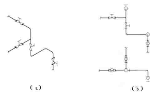 管道流程線要用水平和垂直線表示,管道轉(zhuǎn)彎處一般畫成直角。應避免穿過設備或交叉,在不可避免時,將其中一管道斷開一段,一般同一物料線交錯,按流程順序“先不斷、后斷”;不同物料線交錯,按“主不斷、輔斷”繪制。