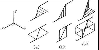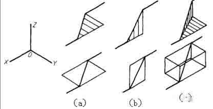 2)當管道平行于直角坐標軸時,軸測圖用平行于對應的軸測軸的直線繪制;當管道不平行于直角坐標軸時,應畫出平行于相應坐標軸的細實線,表示管子所處的平面;管道在水平面內(nèi)傾斜時,畫出與y軸平行的細實線(構成水平面),(a)管道在鉛垂面內(nèi)傾斜時,畫出平行于Z軸的細實線(構成鉛垂面),(b)管道是一般位置時,需要同時畫出與Y軸和Z軸分別平行的細實線,如圖(c) 所示。