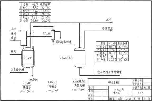 3)常采用圖形與表格結(jié)合的形式,并配以物料流程線,同時在流程線上標注出各物料的名稱、流量以及設備特性數(shù)據(jù)等。
