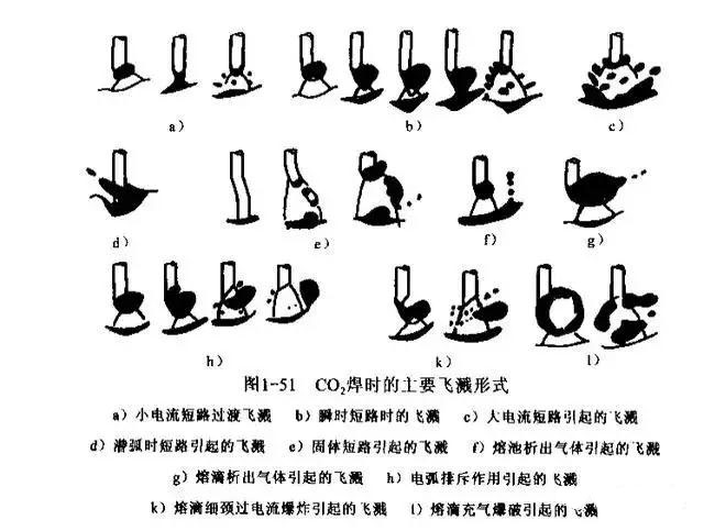 CO2焊時的飛濺形式如圖所示。從中可以看到大致有三種,一為由短路引起的飛濺;二為由氣體析出引起的飛濺;三為由自由過渡時引起的飛濺。