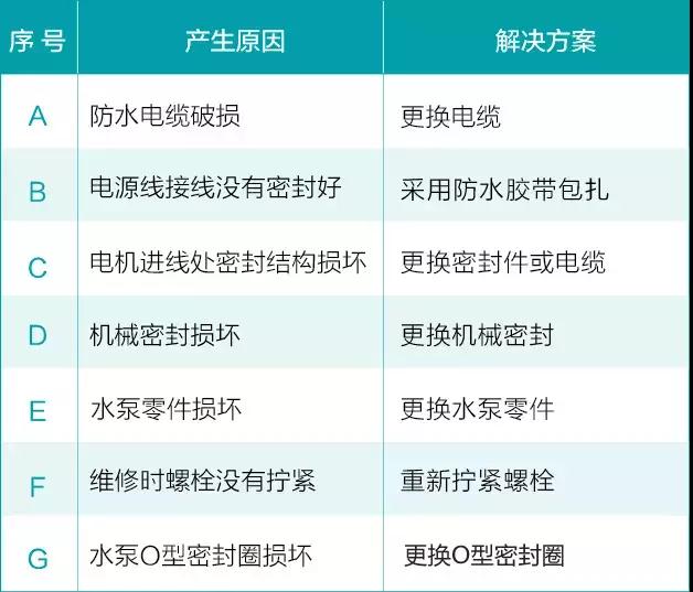 3、水泵電機(jī)進(jìn)線處密封結(jié)構(gòu)損壞進(jìn)水;