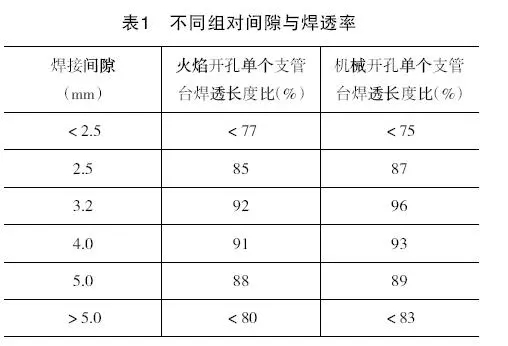 在保證合理的間隙下,機械開孔方式的單個支管臺焊透長度略大于火焰開孔,焊縫外觀質量也優于火焰開孔,這是因為采用機械開孔有利于保證組對間隙均勻,焊縫寬度差和余高差較低。