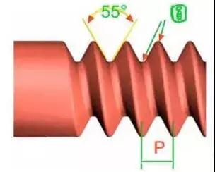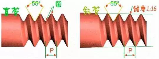 為防止泄漏用的螺紋,經常用于氣體或液體之管件連結。螺紋角為 55 度,可分為直管螺紋代號為”P.S.、N.P.S.”和斜管螺紋代號為“N.P.T.”,其錐度為 1:16,即每尺 3/4 寸。