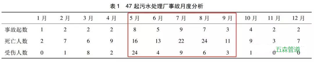 夏季是污水處理廠有毒氣體產(chǎn)生的高峰季節(jié),也是污水處理廠事故高發(fā)的季節(jié),之前作者也建議,不要在夏季去做一些清淤之類的無關(guān)生產(chǎn)的小事,可是一些管理人員安全意識淡薄,導(dǎo)致了很多生命的消逝!《我國污水處理廠事故統(tǒng)計分析與對策研究》[1]中統(tǒng)計了10年間的47例污水處理事故并做了分析: