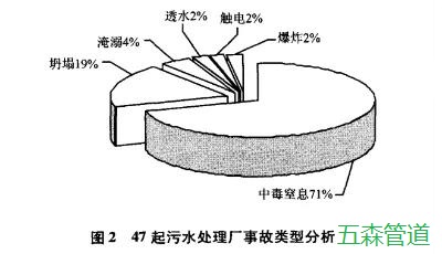 通過對我國污水處理廠事故發(fā)生的類型進(jìn)行統(tǒng)計和分析可以看出的是污水處理廠事故的類型主要是:中毒窒息、坍塌、淹溺、爆炸、觸電、透水等,而其中最主要發(fā)生的事故類型是中毒窒息事故,發(fā)生的概率是70%。就引起中毒事故發(fā)生的原因來看,硫化氫是引起中毒事故的主要原因,沼氣是引起窒息事故的主要原因。而且中毒事故中容易對工作人員造成人員傷害的主要原因是個人的防護(hù)用品失去了效果或者并沒有按照規(guī)定在作業(yè)期間使用防護(hù)用品。而且污水處理廠設(shè)備出現(xiàn)缺陷、錯誤的操作、設(shè)施沒有達(dá)到規(guī)定的標(biāo)準(zhǔn)、通風(fēng)不良等都是造成人員傷亡的原因,但是個人防護(hù)用品的使用是引起中毒窒息事故中人員傷亡的主要原因,發(fā)生率高達(dá)78%。