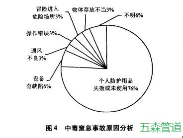 通過對總事故中中毒窒息事故的分析與統(tǒng)計我們可以看出,工作人員的個人防護(hù)用品沒有按照規(guī)定檢查失效,以及沒有使用是事故造成人員傷亡的主要原因,占總數(shù)的78%,污水處理廠運(yùn)行的設(shè)備有缺陷也是造成事故中人員傷亡的原因之一,占總數(shù)的7%。由于通風(fēng)不良、或者錯誤的操作、在有危險的情況下冒險進(jìn)入危險場所、物品存放不恰當(dāng)?shù)冗@些原因也都是會引起中毒窒息事故的發(fā)生的,就上述情況來看,為了減少中毒窒息對人員傷亡事故的發(fā)生,保證工作人員的防護(hù)用品有效、并且正確的使用是關(guān)鍵的手段。
