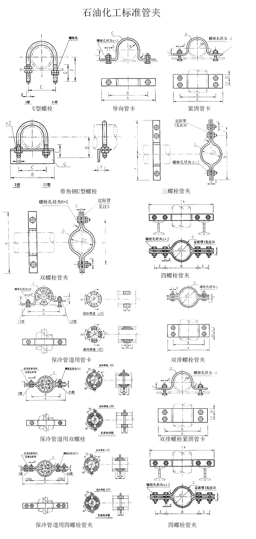 A1 U型螺栓;A2 U型螺栓(帶角鐵);A3導向管卡;A4 緊固管卡;A5 基準型雙螺栓管夾;A6 重型雙螺栓管夾;A7 三螺栓管夾;A8三螺栓管夾(支托用);A9 雙排螺栓管夾;A10四螺栓管夾;A11雙排螺栓壓緊管夾;A12 管卡(保冷管道);A13 雙螺栓管夾(保冷管道);A14 四螺栓管夾(保冷管道)。