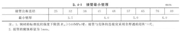 接管的厚度除要考慮上述要求外,還需考慮焊接方法、焊接參數(shù)、加工條件、施焊位置等制造上的因素及運(yùn)輸、安裝中的剛性要求。