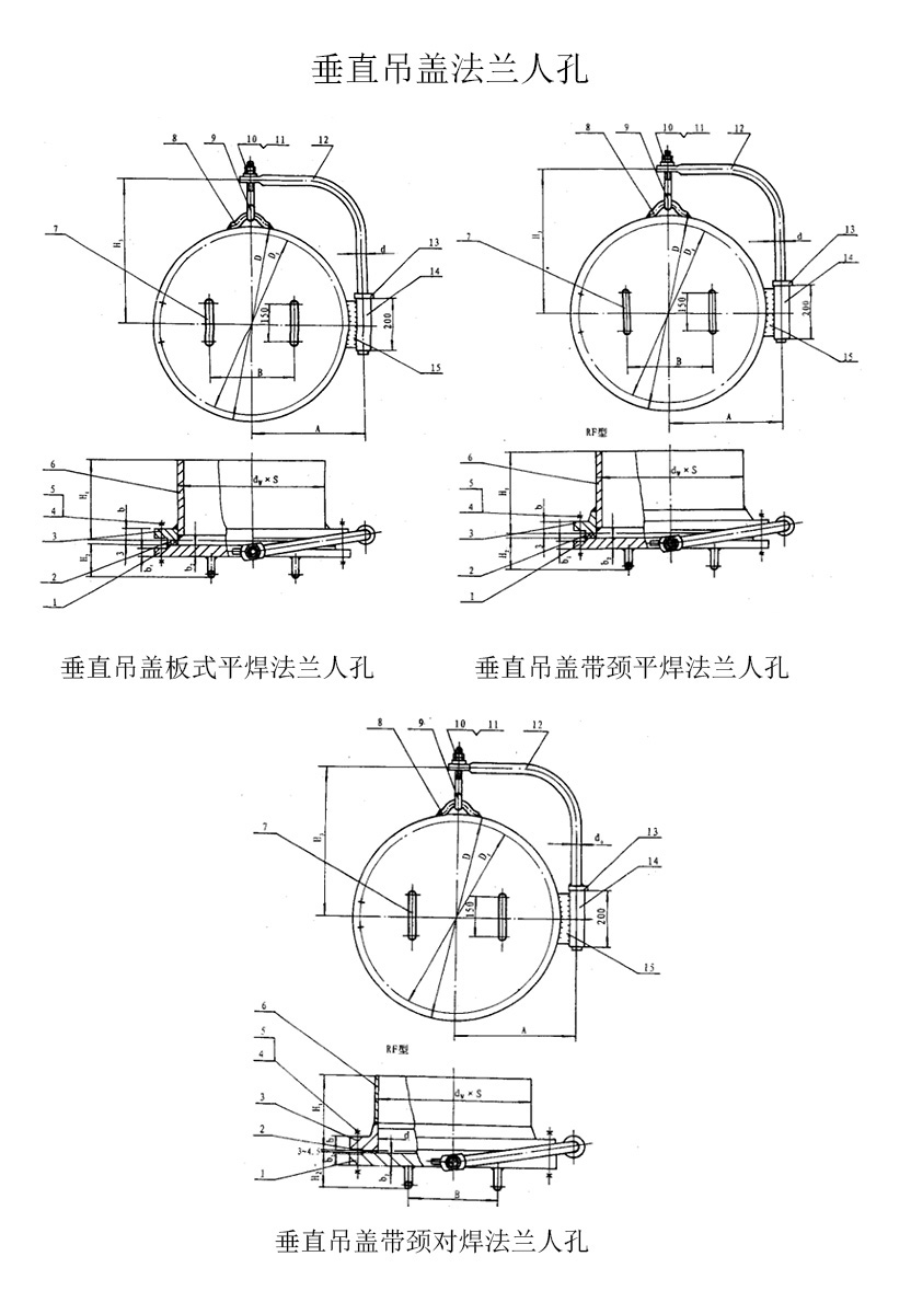 垂直吊蓋板式平焊法蘭人孔、垂直吊蓋帶頸平焊法蘭人孔、垂直吊蓋帶頸對(duì)焊法蘭人孔